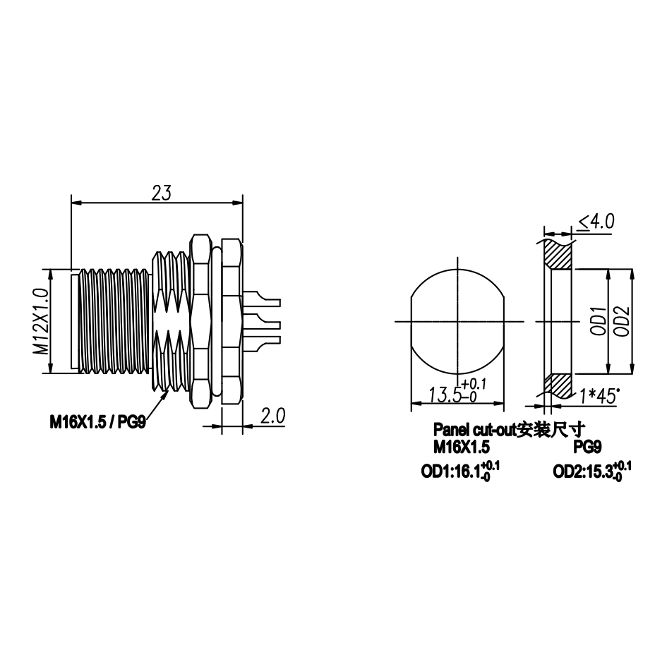 M12 Male Panel Mount, Solder Type, Front Fastened