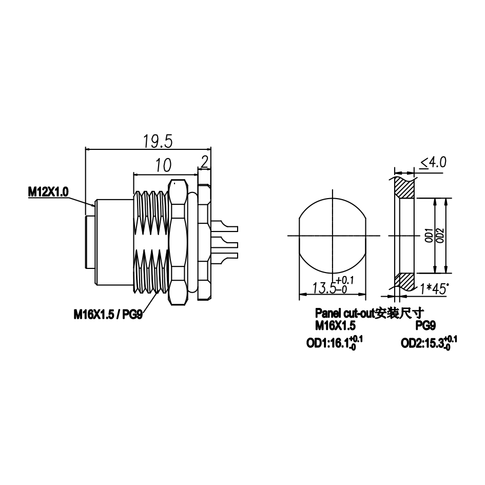 M12 Female Panel Mount, Solder Type, Front Fastened