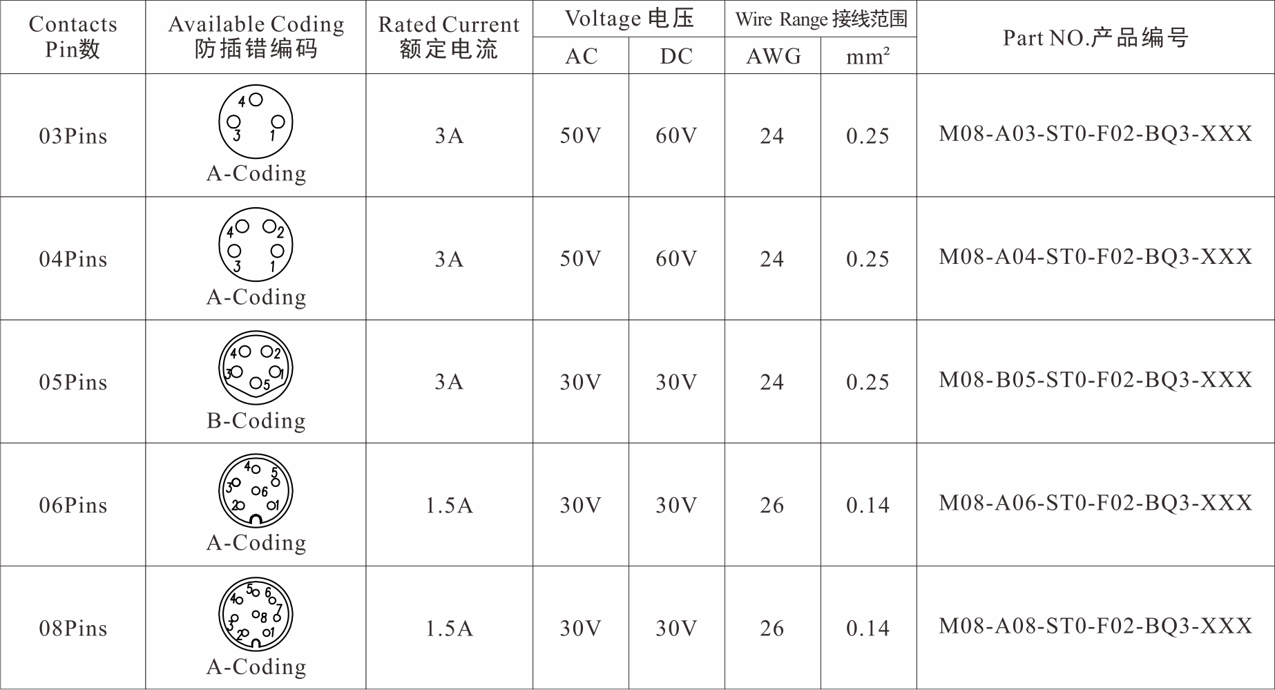 Part No 產(chǎn)品編碼:M08-X**-ST0-F02-BQ3-XXX